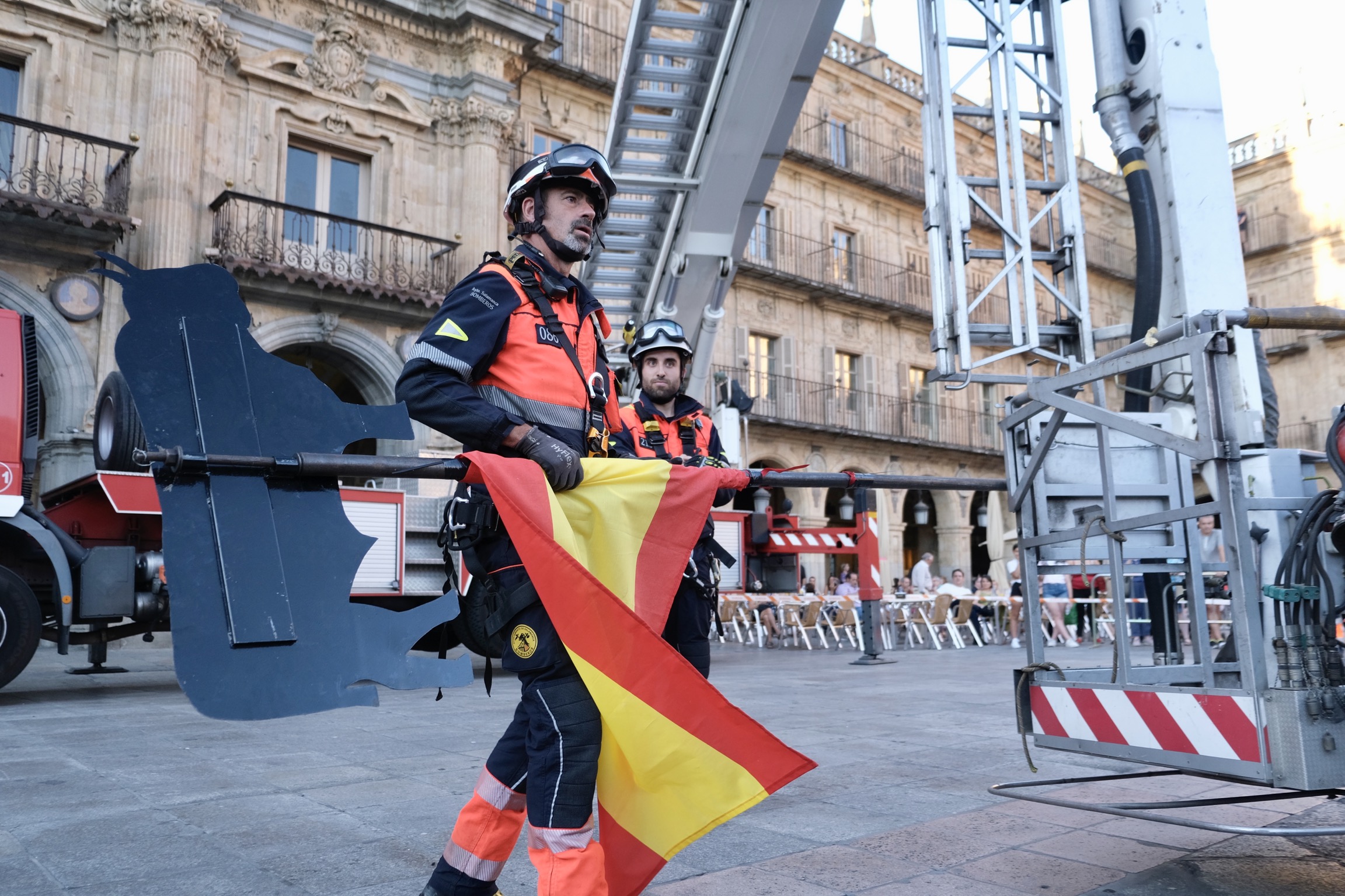 Como ya es habitual los Bomberos de la capital han izado el símbolo anunciador de las Ferias y Fiestas 2022 en honor a la Virgen de la Vega compuesto por una bandera de España y la silueta de un toro negro.