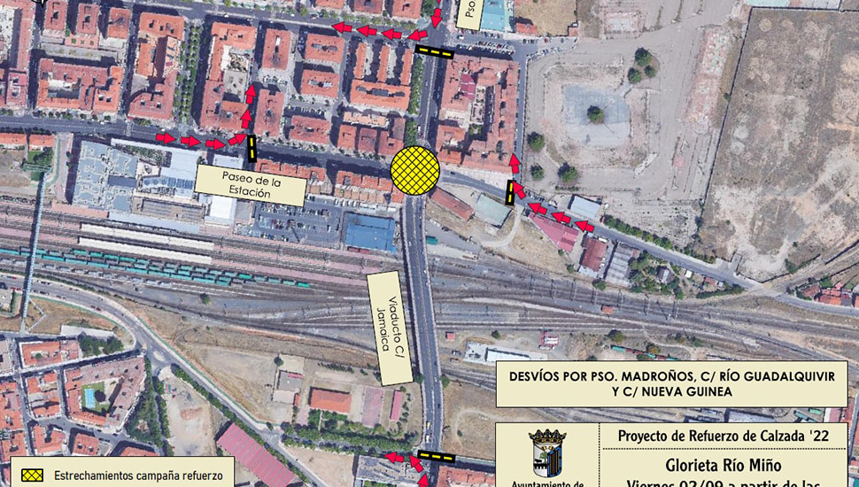 Por su parte, en la Glorieta de Río Miño se cortará el tráfico de acceso a partir de las 23:00 horas desde la Avenida de los Cipreses, Paseo de la Estación, Calzada de Medina y calle Jamaica, desviándose el tráfico de vehículos, respectivamente, por el Paseo de los Madroños, calle Río Guadalquivir y calle Nueva Guinea.