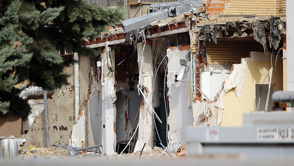 También puede verse gran cantidad de escombros pertenecientes a la fachada exterior donde ya hay algún agujero en las partes delantera, trasera y laterales. Ayudados por máquinas, vacían poco a poco la vieja infraestructura que muy pronto comenzará a ser destruida a mayor escala, siempre con la máxima seguridad y protección para los salmantinos.