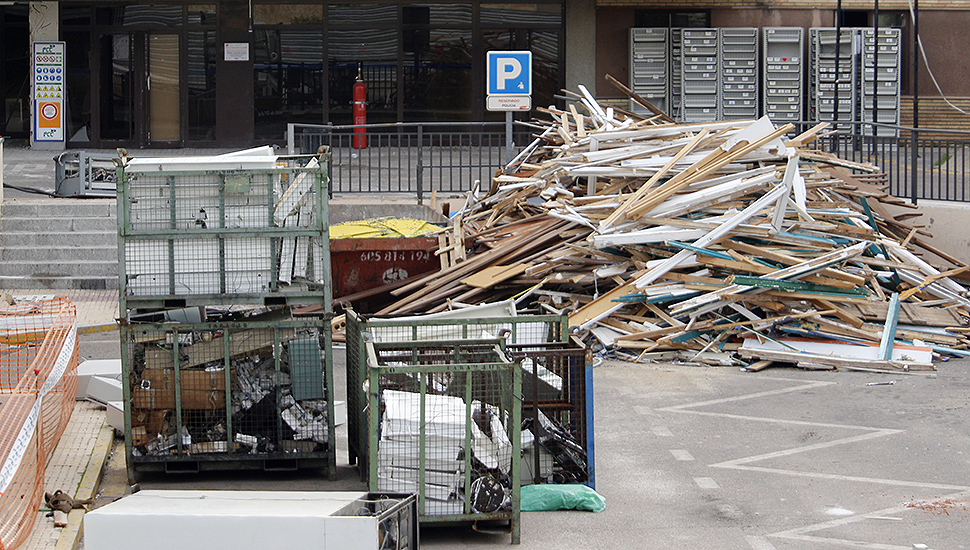 A lo largo de estos meses hemos podido ver como se ha ido desescombrando su interior y se han reunido todo tipo de utensilios como mesas, sillas, ventanas, estanterías, taquillas, radiadores... Ahora en los exteriores del antiguo hospital pueden verse gran cantidad de sacos que acumulan, a buen seguro, materiales provenientes desde el interior ya que la estructura exterior apenas ha cambiado.