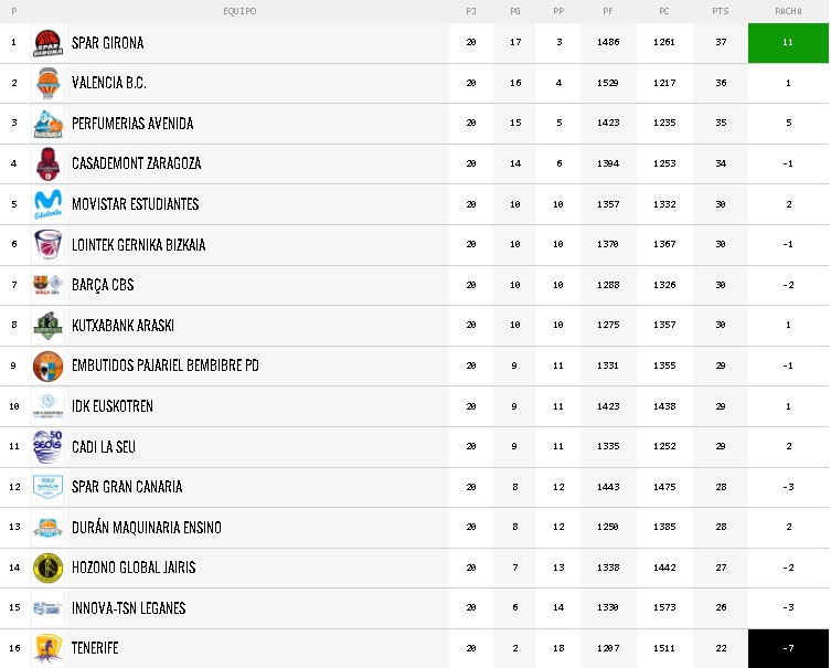 Por delante del equipo salmantino se sitúan Valencia (2) con 16 triunfos y 4 partidos pérdidos y es líder Spar Girona con 17 partidos ganados y 3 perdidos. En cuarta posición tras la última jornada se queda Casademont Zaragoza con un balance de 14-6.