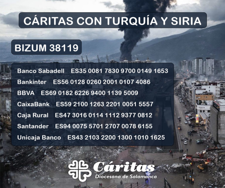 Por ese motivo, la Diócesis de Salamanca se sumará a la campaña de emergencia que prestará Cáritas Española para esta catástrofe, y la colecta del próximo 19 de febrero se gestionará a través de esta organización de la Iglesia de Salamanca, que ha habilitado varios canales para la realización de donativos, bien por transferencia o por bizum, al número 38119, con el concepto: 'Terremoto de Turquía y Siria'.