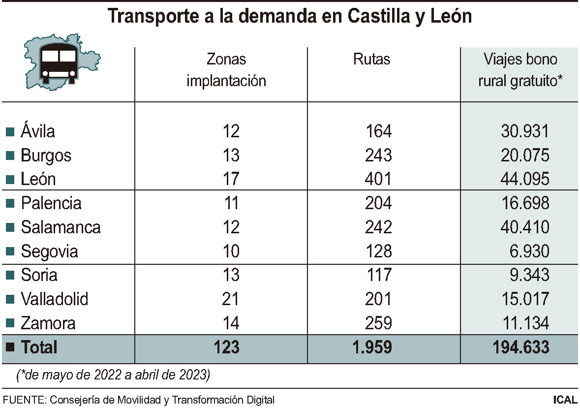 El Bono Rural gratuito de Transporte a la Demanda se acerca a los 200.000 viajes en el último año, tras completar en mayo de 2022 su despliegue por 1.959 rutas de Castilla y León. Esta iniciativa, que permite desplazarse sin coste por los territorios de la Comunidad, está siendo utilizada en su mayoría por personas mayores, de hecho un 90 por ciento tiene más de 50 años, según los datos de la Consejería de Movilidad y Transformación Digital consultados por Ical.