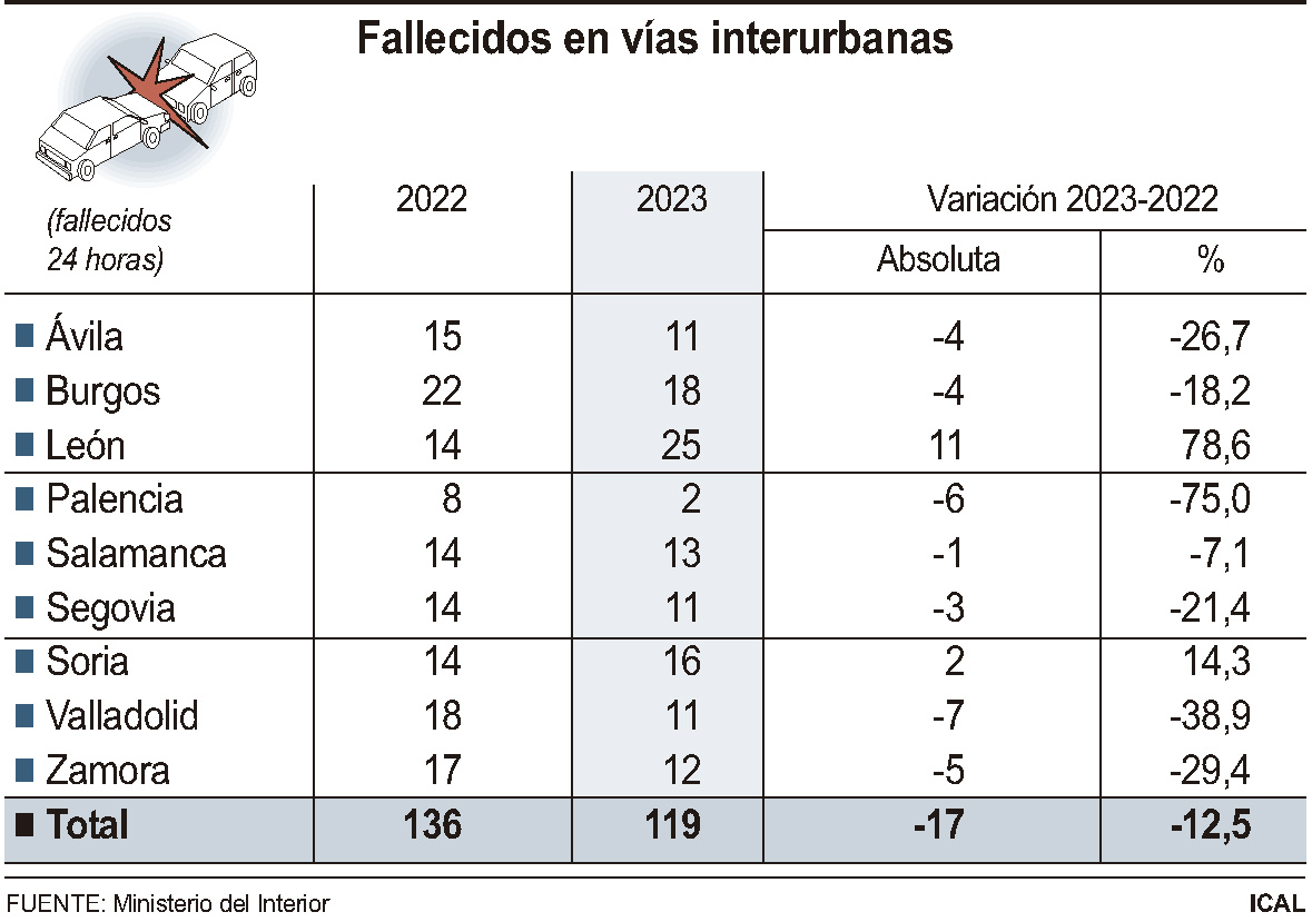 Burgos y León registraron las mayores cifras de siniestralidad vial. En el caso de Burgos, hubo una disminución respecto al pasado año de un once por ciento, con dos menos, hasta los 18 muertos. En cambio, León tuvo un aumento del 85 por ciento (once más), hasta los 25 fallecidos. Por el contrario, Palencia contabilizó la menor cifra con el 1 por ciento del total, con dos fallecidos, que supone un descenso del 75 por ciento. Entre medias, se situaron los 16 muertos de Soria (14,3 por ciento más); los 13 de Salamanca (-7,1 por ciento); los doce de Zamora (-29,4 por ciento); los once de Ávila (-26,7 por ciento); otros once en Valladolid (-38,9 por ciento) y otros tantos en Segovia (-21,4 por ciento).