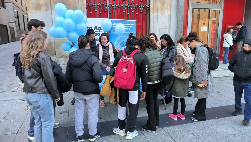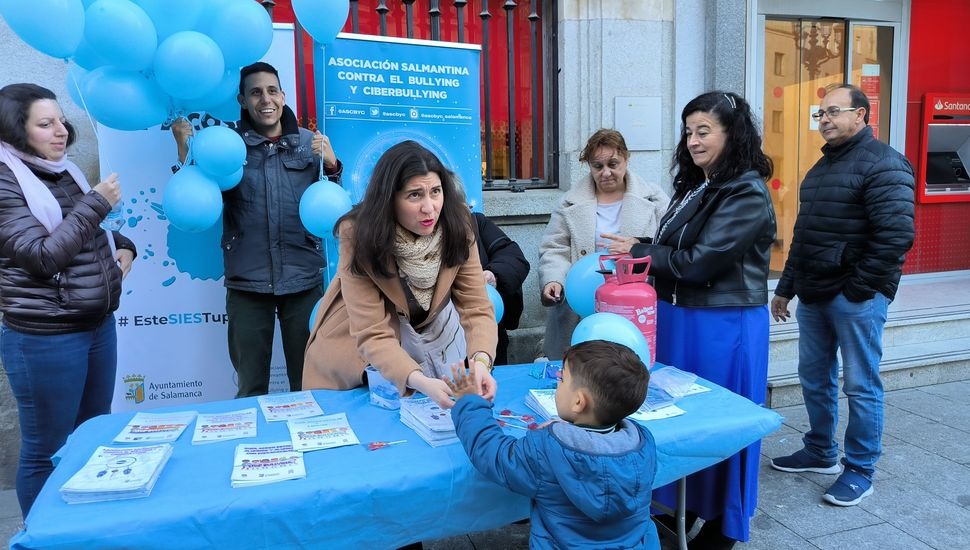 La Asociación Salmantina contra el Bullying y el Ciberbllying (ASCBYC) ha instalado durante la tarde de este jueves un punto azul en la plaza del Liceo con el que se pretende concienciary sensibilizar a los salmantinos sobre esta problemática.