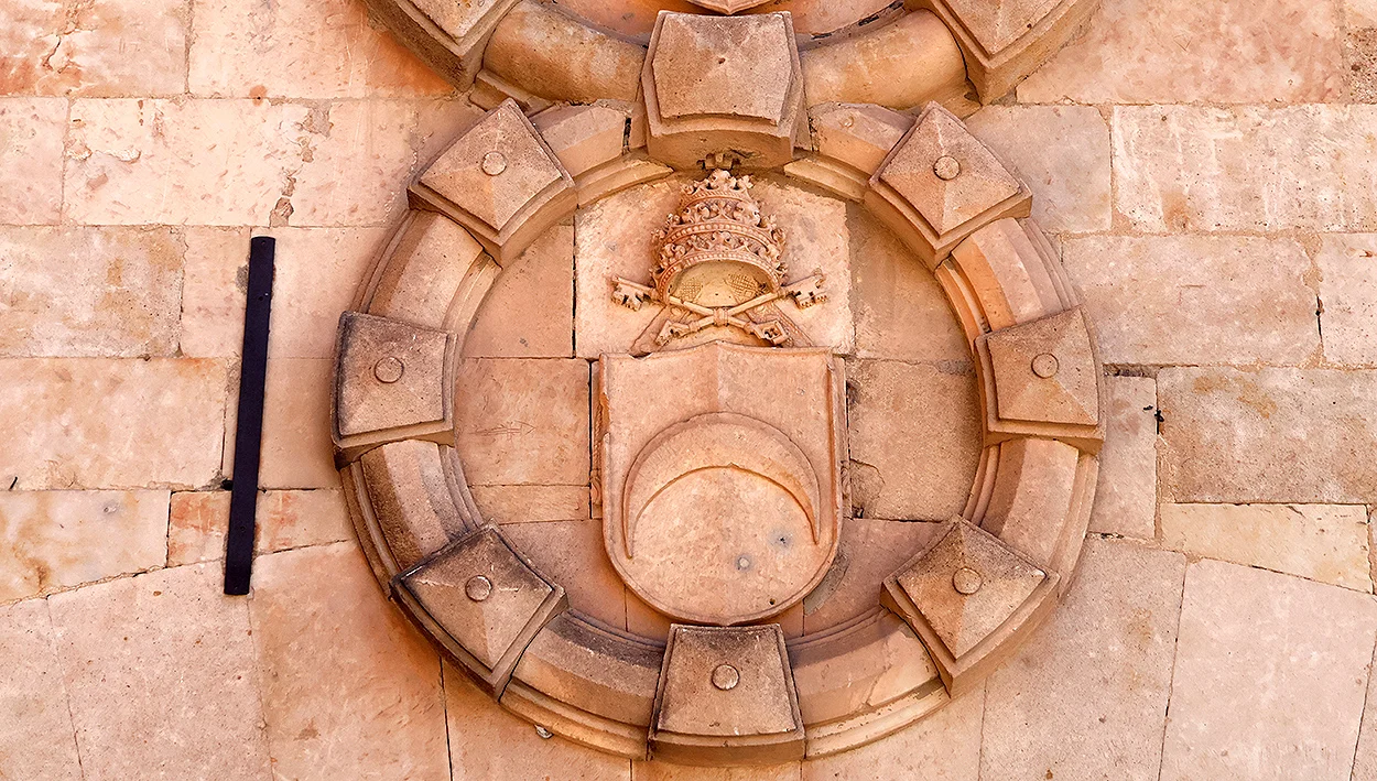 Detalle del escudo heráldico del Papa Luna en las Escuelas Mayores.