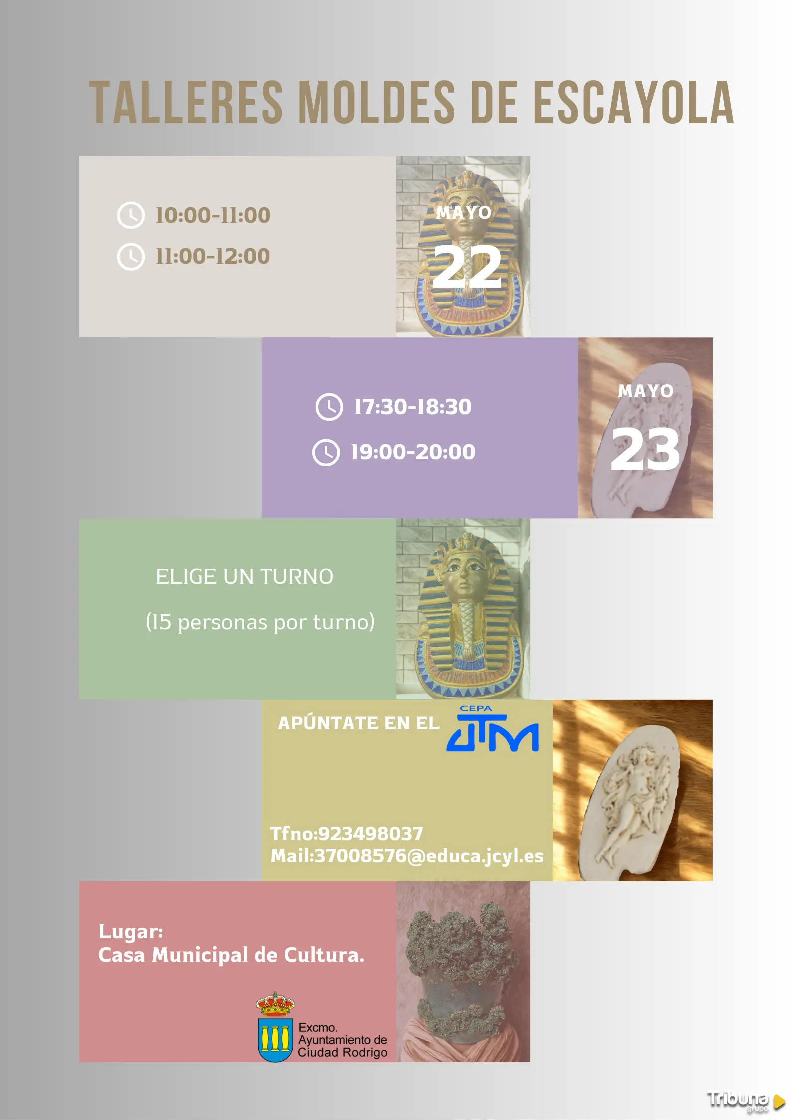 Asimismo, según han explicado desde el Consistorio mirobrigense, los días 22 y 23 mayo habrá cuatro talleres de moldes de escayola, donde cualquier persona, ya sea alumna o no del centro, y de cualquier edad podrá realizar una pieza en escayola.