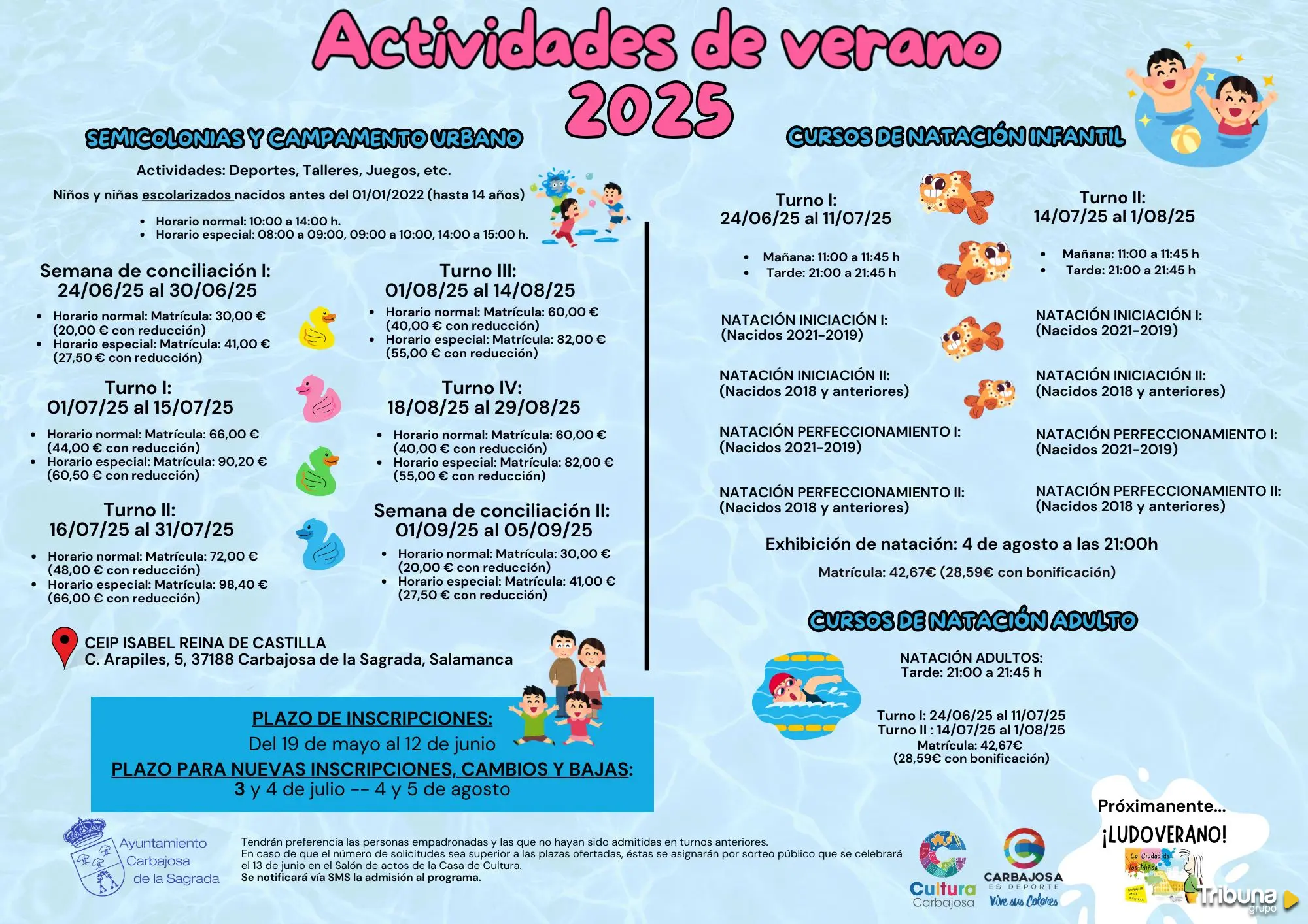 El Ayuntamiento de Carbajosa de la Sagrada ha abierto el plazo de inscripción para las actividades de verano, que podrá realizarse hasta el 12 de junio. Este programa de actividades dará comienzo el próximo 24 de junio, una vez finalizado el curso escolar, y está dirigido principalmente a niños en edad escolar, así como a personas adultas en el caso de los cursos de natación.