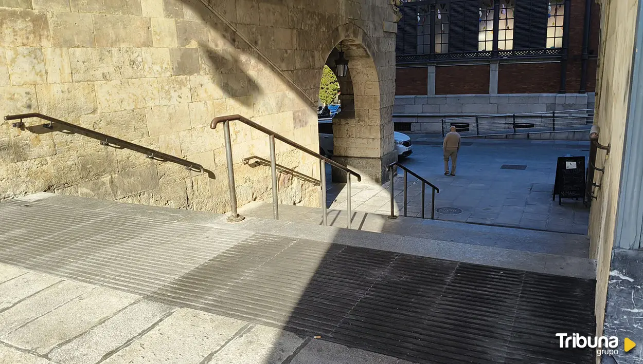 Finalmente, los operarios ultiman los preparativos para intervenir en la escalera de Ochavo (la que comunica con la plaza de Poeta Iglesias), donde también se instalarán baldosas direccionales, aunque en este caso curvadas, dada la forma de los peldaños. Las vallas de obra se colocaron ayer.