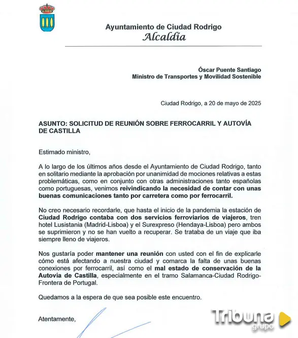 El alcalde de Ciudad Rodrigo, Marcos Iglesias, ha remitido al ministro de Transportes y Movilidad Sostenible, Óscar Puente, una solicitud de reunión para "explicarle cómo está afectando a nuestra ciudad y comarca la falta de unas buenas conexiones por