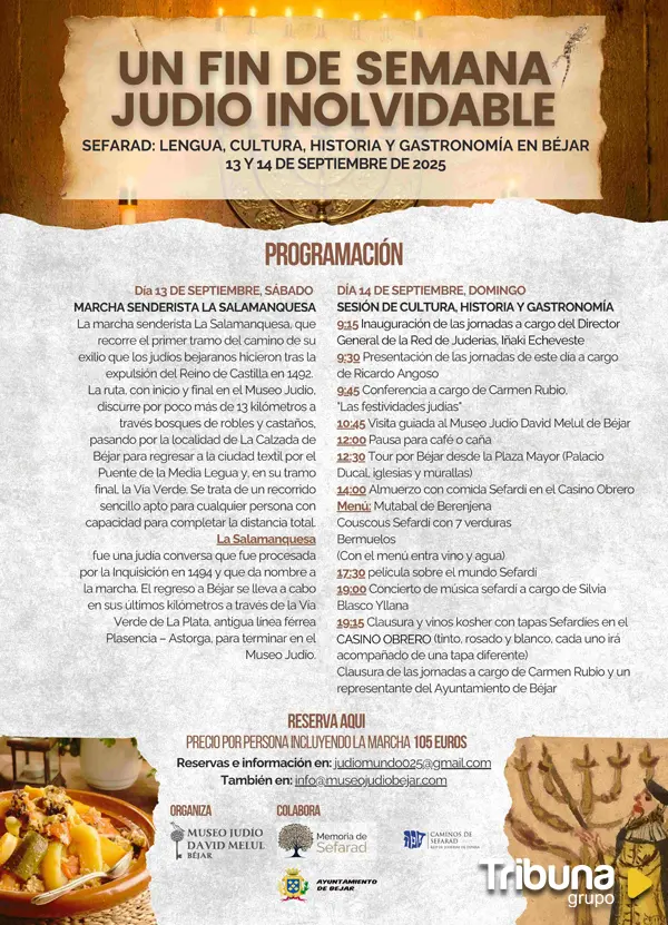 Por su parte, el día 14 se destinará a promocionar la cultura, historia y gastronomía judías. La jornada arrancará con la inauguración oficial a cargo del director de la Red de Juderías, Iñaki Echeveste. A lo largo de la mañana habrá conferencias, visitas guiadas por el museo Judío David Melul y por el barrio judío de Béjar. A continuación, almuerzo con comida sefardí y, por la tarde, proyección de una película sobre el mundo sefardí y clausura con vino koser y tapas sefardies en el Casino Obrero.