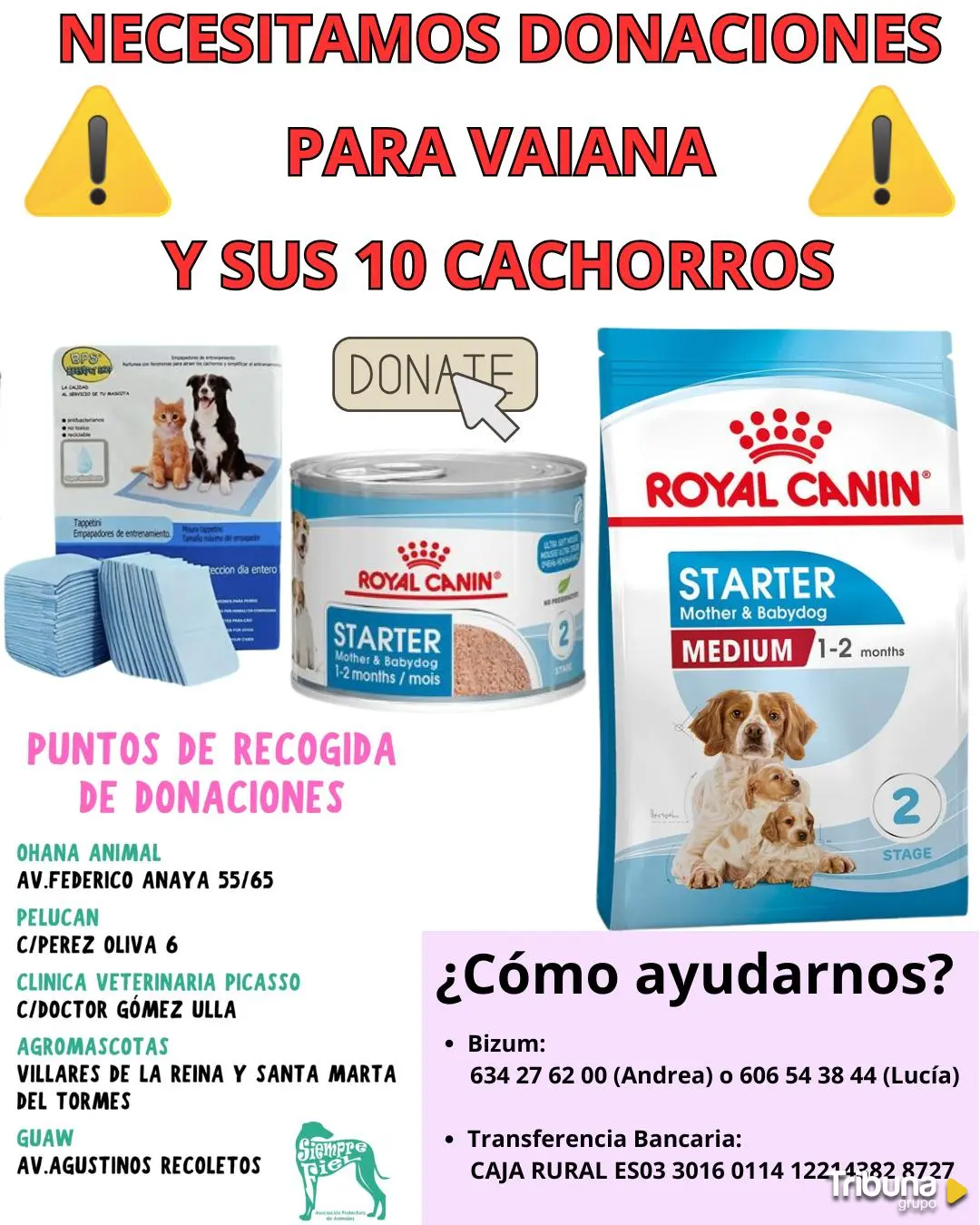 Uno de los casos más urgentes de la jornada es el de Viana, una perrita rescatada en situación crítica junto a sus 10 cachorros recién nacidos. La protectora solicita ayuda urgente para cubrir sus necesidades básicas con varios puntos de recogida habilitados.