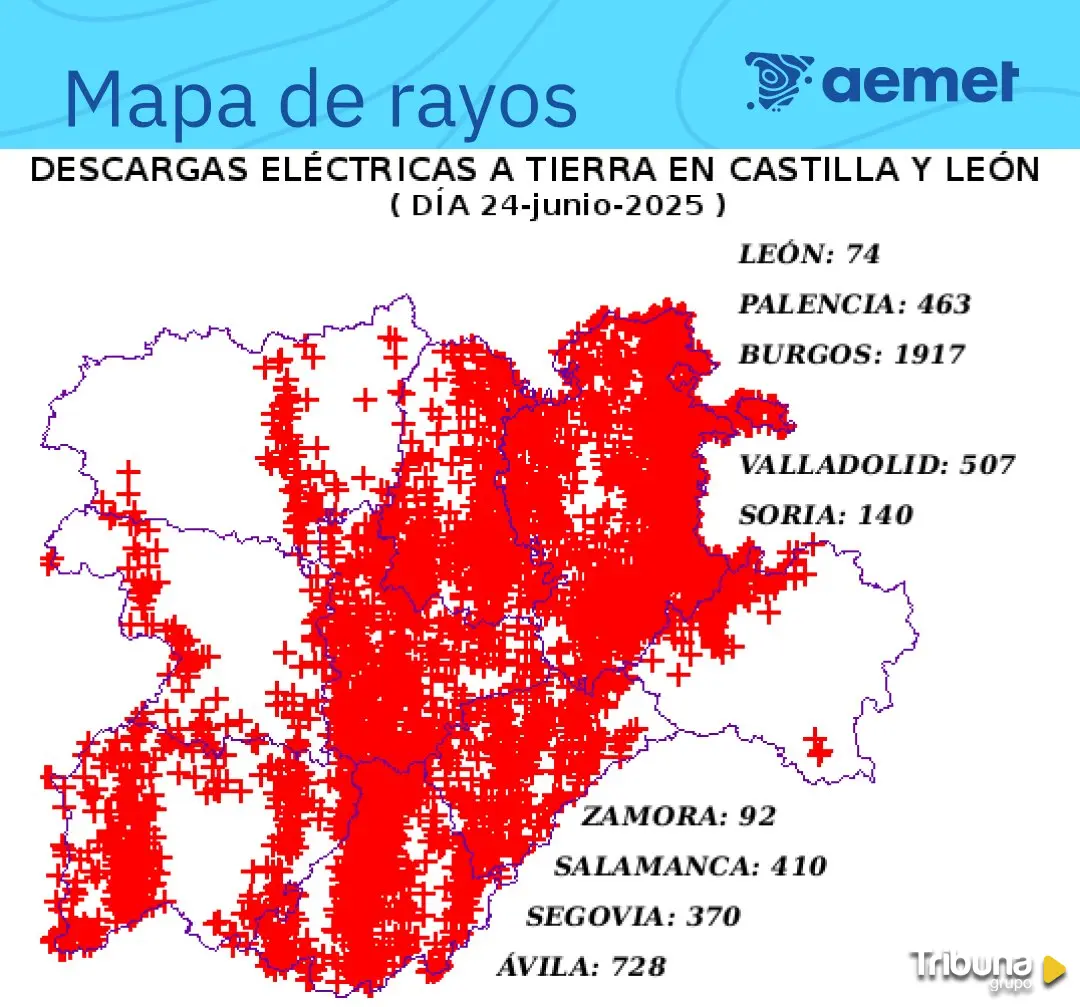 En total, Castilla y León recibió 4.701 descargas a tierra, según los datos de la Aemet en la Comunidad, de los que 1.917 fueron en Burgos. Además, Ávila recibió 728 descargas, Valladolid 507, con 463 en Palencia, y 370 en Segovia.