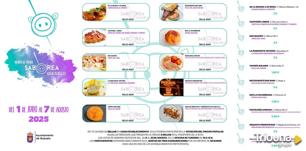 Además, el público también tendrá voz. Los comensales podrán votar por su favorito para otorgar el título de 'Pincho Popular de Guijuelo', dotado con 300 euros. Las votaciones podrán realizarse de manera presencial en la Oficina Municipal de Turismo hasta el 22 de agosto, entregando una cartilla con al menos ocho sellos de los diez posibles.