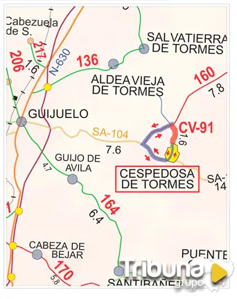 La carretera CV-91, en el tramo comprendido entre la salida de la travesía de Cespedosa de Tormes y su intersección con la carretera DSA-160, permanecerá cerrada al tráfico de vehículos desde el 1 de julio hasta el 29 de septiembre, con motivo de las obras de refuerzo del firme y acondicionamiento del trazado.