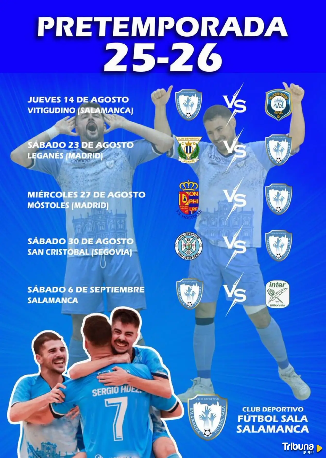 El equipo empezará los amistosos el 14 de agosto en Vitigudino, un lugar de la provincia en el que se enfrentarán al Villaquilambre. A partir de ahí, los salmantinos visitarán al CD Leganés el día 23, al Móstoles FS el 27 y al CD San Cristóbal de Segovia el 30.