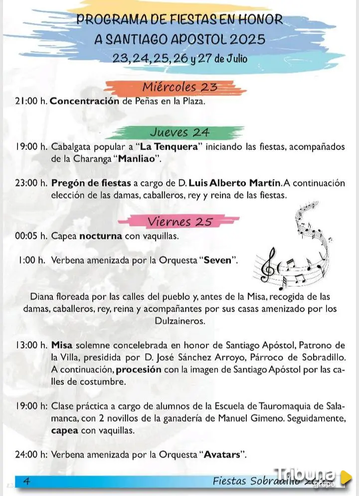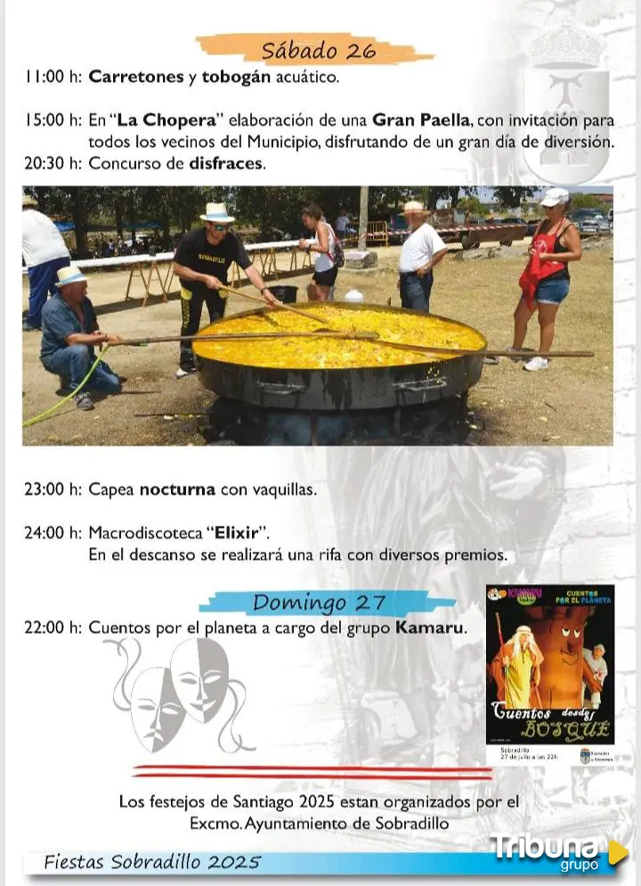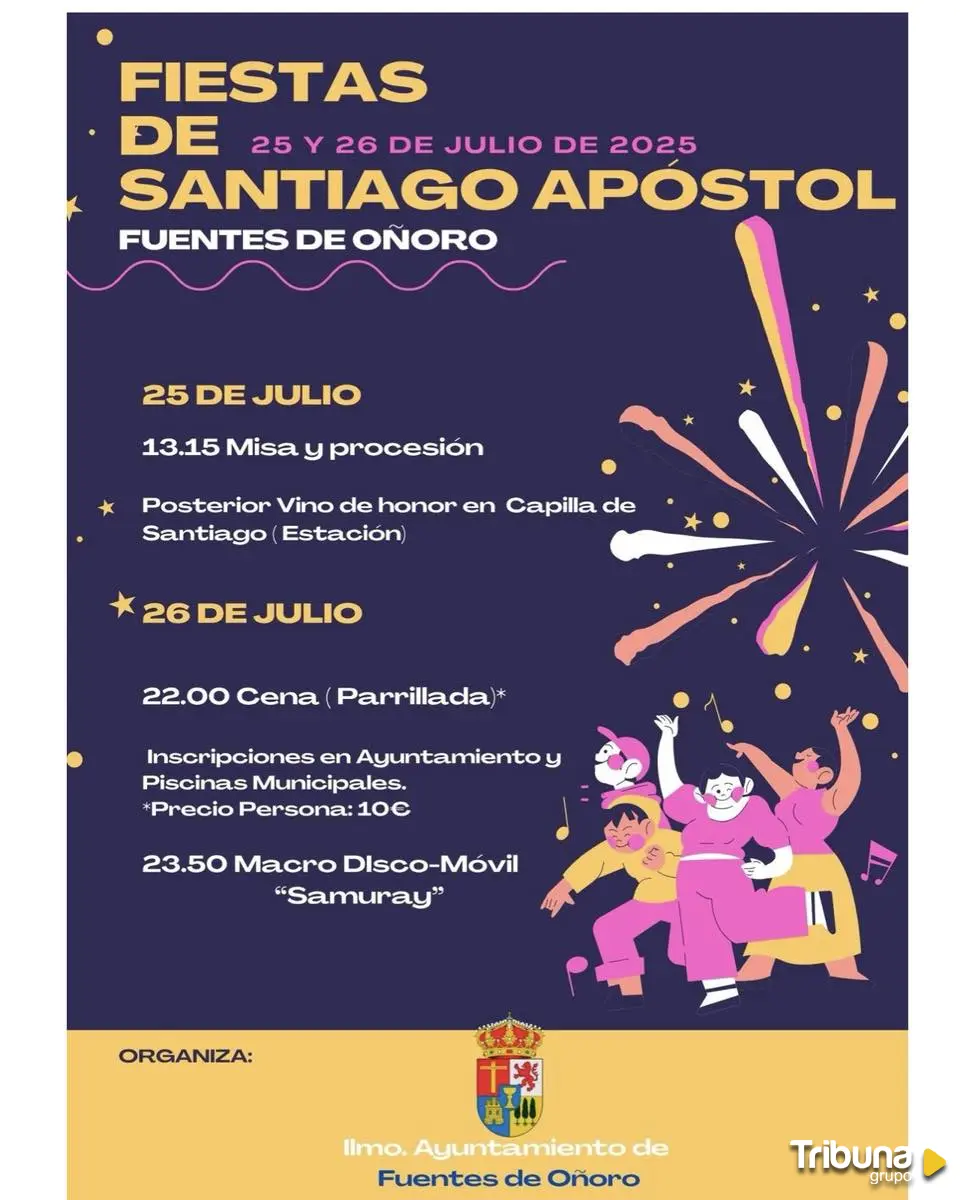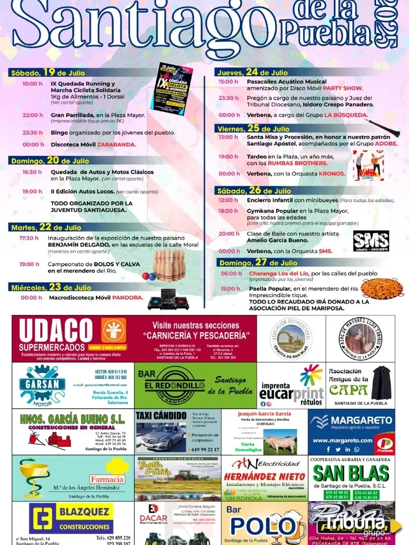 La celebración de la festividad de Santiago Apóstol llenará de fiestas este municipio, con propuestas en las que no faltan la eucaristía y la procesión en honor al patrón, una clase práctica de la Escuela de Tauromaquia, las verbenas nocturnas, un tobogán acuático o una paella popular.