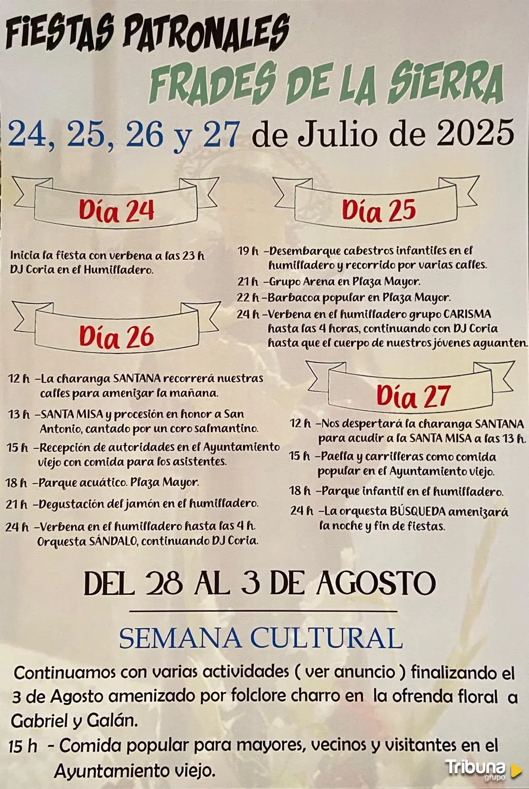 La provincia de Salamanca se llenará de música, tradición y alegría este fin de semana con la celebración de las fiestas patronales en numerosos pueblos. Desde verbenas populares hasta encierros, procesiones y comidas vecinales, decenas de municipios salmantinos han preparado una completa agenda festiva para vecinos y visitantes. Las celebraciones, que coinciden con la recta final de julio y la festividad de Santiago, marcan uno de los momentos más animados del verano en el medio rural, donde la población se multiplica y la participación se vive con entusiasmo.
