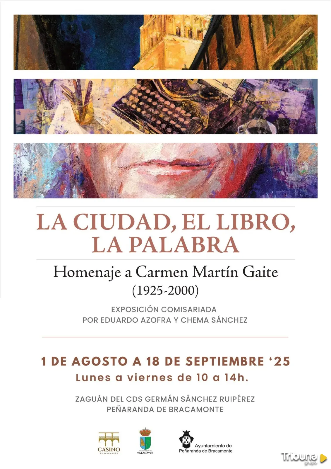 El Casino de Salamanca, el Ayuntamiento de Villamayor y el Ayuntamiento de Peñaranda de Bracamonte unen fuerzas con motivo del centenario del nacimiento de Carmen Martín Gaite (1925-2000) y presentan la exposición 'La ciudad, el libro, la palabra', un homenaje artístico que celebra la vida y obra de la insigne escritora salmantina. La muestra se podrá disfrutar en el zaguán del CDS de Peñaranda de Bracamonte del 1 de agosto al 18 de septiembre de 10:00 a 14:00 y de lunes a viernes.