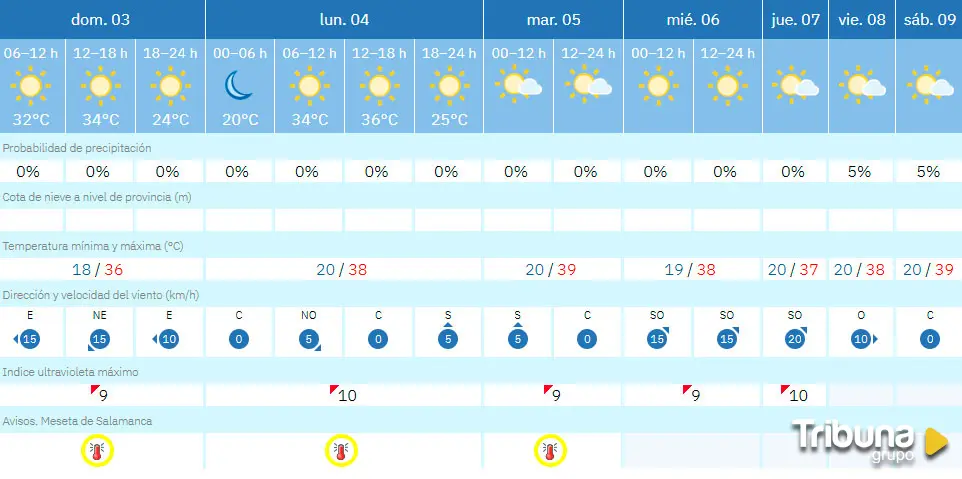 En concreto, para este domingo la Aemet activa el aviso desde las 13 hasta las 20:59 horas por temperaturas máximas de 36 grados en la meseta, 35 en el Sistema Central y 37 grados en el sur de la provincia. Según la previsión para esta jornada, en la capital charra se esperan cielos despejados con máximas de 36 grados y mínimas de 18.