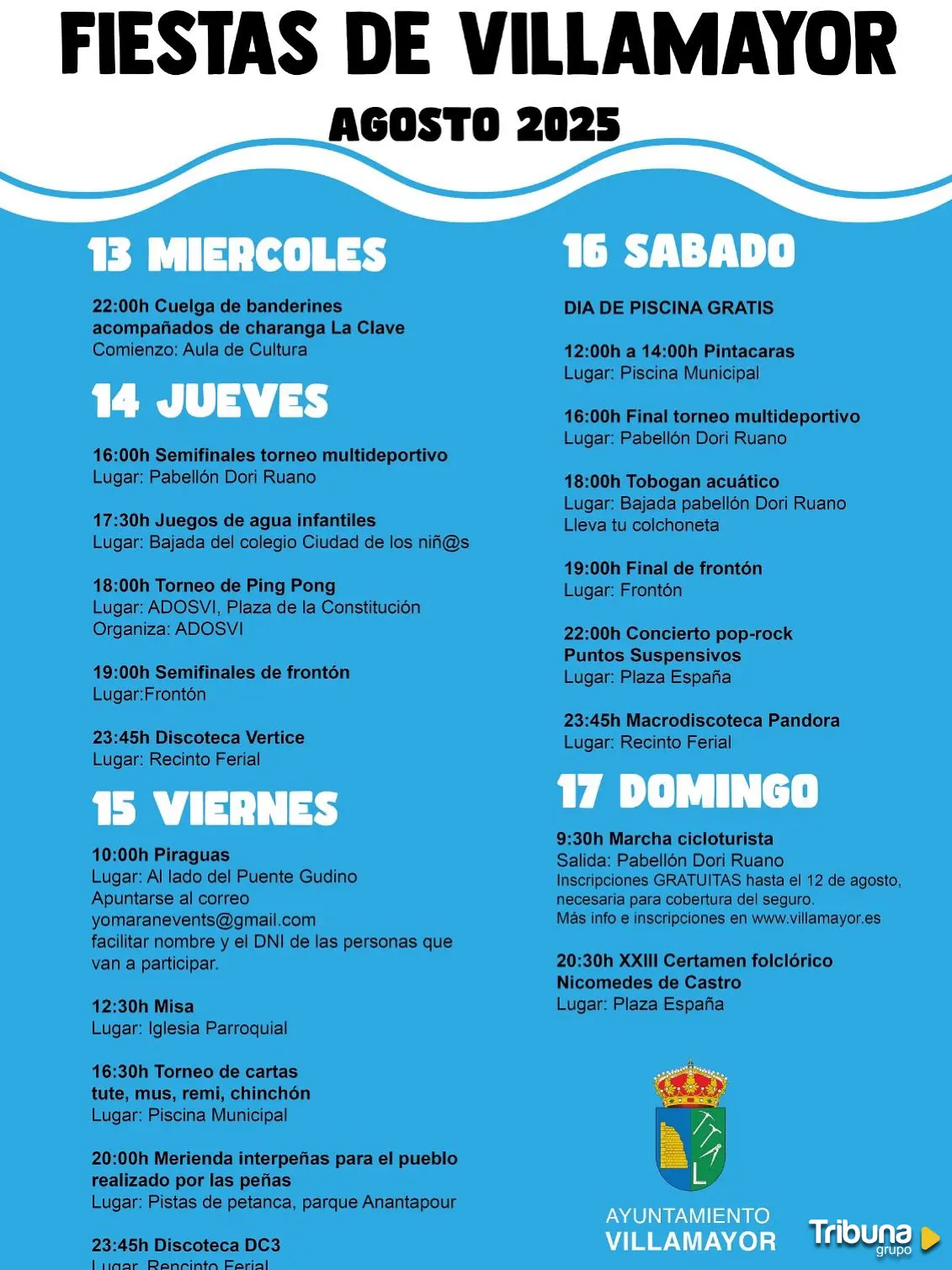 El Ayuntamiento de Villamayor anuncia la celebración de las Fiestas de Verano 2025 entre el 13 y el 17 de agosto.