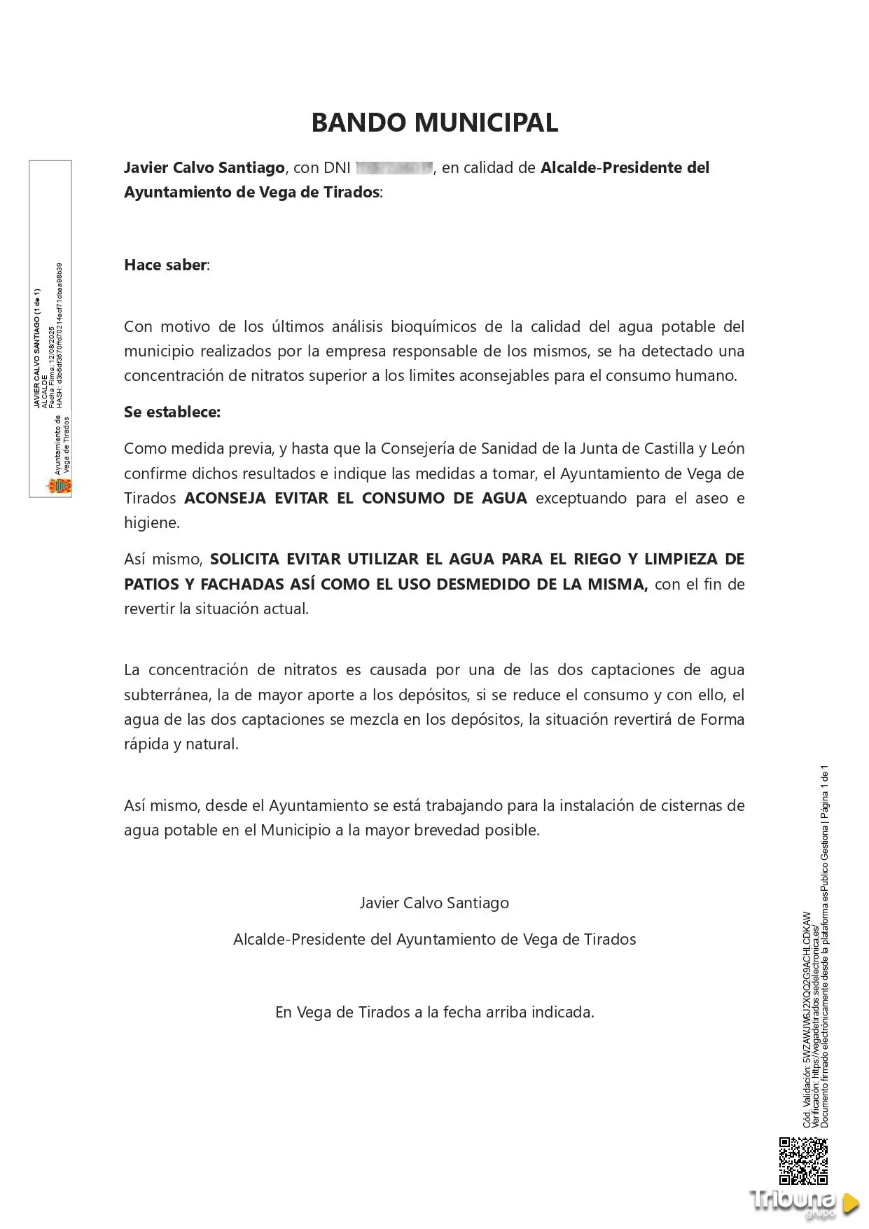 El Ayuntamiento de Vega de Tirados ha aconsejado a sus vecinos evitar el consumo de agua del grifo, salvo para el aseo y la higiene, debido a la presencia de una concentración de nitratos superior a los límites aconsejables para el consumo humano. Así lo ha recomendado el Ayuntamiento del municipio en un bando emitido por el alcalde, que ha explicado que se han detectado tras los "últimos análisis bioquímicos de la calidad del agua potable del municipio realizados por la empresa responsable de los mismos".