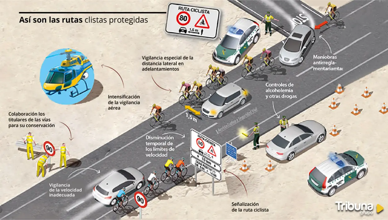 Muchos son los salmantinos que habitualmente en fin de semana o en festivos se calzan el maillot, ajustan el casco y salen a rodar en bicicleta por las carreteras de la provincia. El ciclismo, ya sea como deporte, afición o simple manera de disfrutar del paisaje, ha ido ganando terreno en los últimos años hasta convertirse en una de las actividades de ocio más practicadas. Sin embargo, compartir calzada con vehículos a motor sigue siendo un riesgo para los ciclistas y la seguridad se convierte en un aspecto fundamental. Con ese objetivo nacieron las Rutas Ciclistas Protegidas, tramos señalizados y vigilados en los que se extreman las precauciones para reducir la siniestralidad y garantizar una convivencia más segura entre conductores y ciclistas.