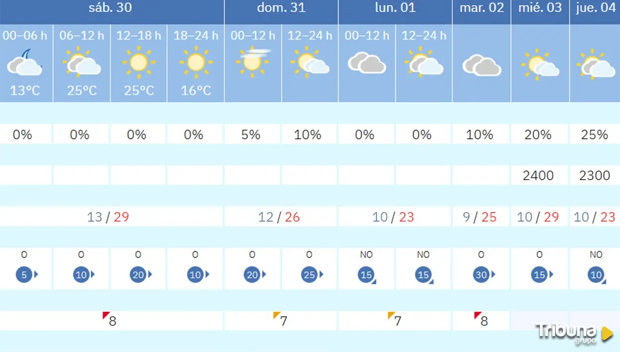 Tras el fin de semana, el último del mes de agosto, en el que las temperaturas máximas se situarán en Salamanca en los 28 y 29 grados, a partir de la próxima semana las temperaturas rondarán entre los 23 grados previstos para el lunes, día 1, y los 29 grados para el miércoles, día 3. Las mínimas estarán entre los 10-12 grados.