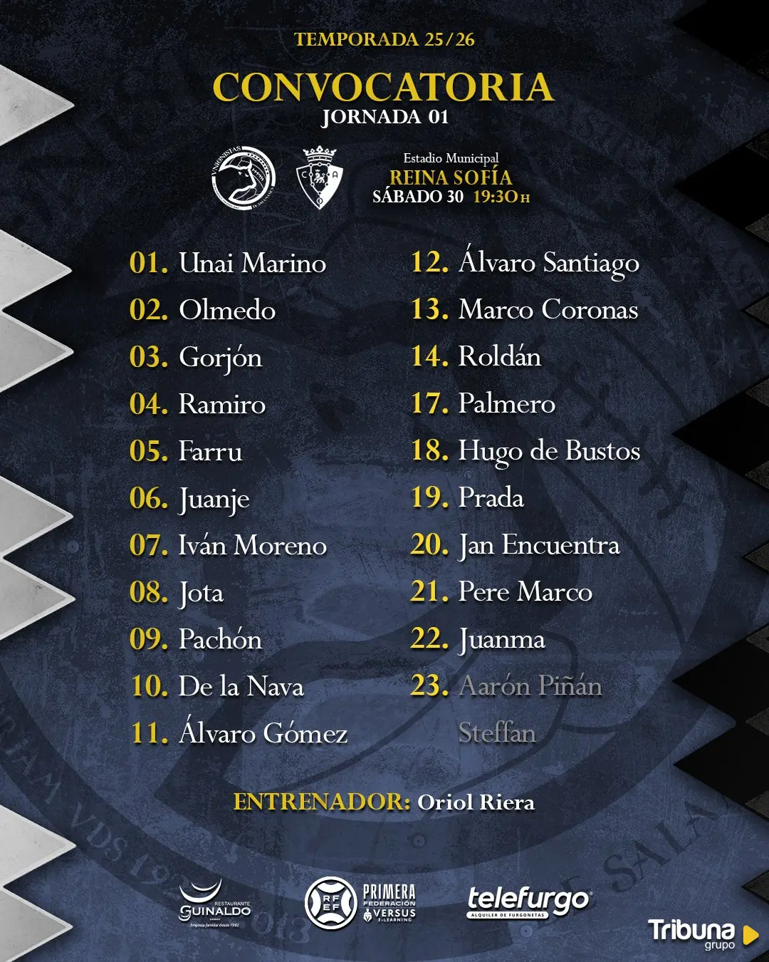 Enfrente estará un Osasuna Promesas que cuenta entre sus filas con Mikel Serrano, un futbolista que arrancó la pretemporada en Unionistas pero que decidió hacer la maleta con destino a la cantera pamplonica. Eso sí, Riera llega a la primera cita con la duda del rival que se encontrarán en casa, conjunto entrenador por Santi Castillejo y del que han podido obtener pocas imágenes, pero al que esperan "preparados" y con "ritmos altos".