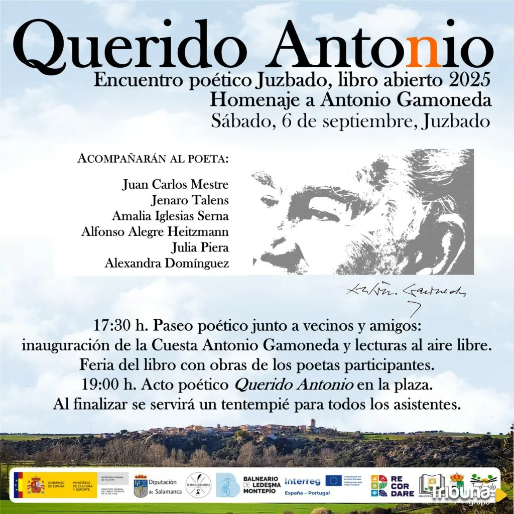El acto reunirá a vecinos y visitantes en torno a la figura de Gamoneda, que ya visitó el pueblo en el 2009, 2011 y 2025. Ahora, con sus 94 años, Juzbado le rinde un homenaje titulado 'Querido Gamoneda' en compañía de un destacado grupo de poetas, entre los que se encuentran Juan Carlos Mestre, Jenaro Talens, Amalia Iglesias Serna, Alfonso Alegre Heitzmann, Julia Piera y Alexandra Domínguez.