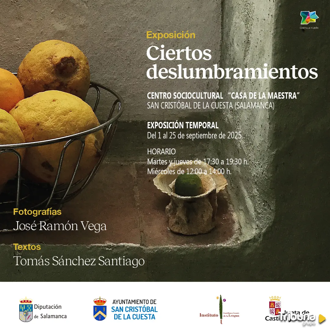 La exposición fotográfica 'Ciertos deslumbramientos', organizada por la Diputación de Salamanca y el Instituto Castellano y Leonés de la Lengua, llega a San Cristóbal de la Cuesta, donde podrá visitarse en el Centro Sociocultural Casa de la Maestra del 1 al 25 de septiembre. La muestra reúne 24 imágenes del fotógrafo leonés José Ramón Vega, acompañadas por textos del escritor zamorano Tomás Sánchez Santiago, en un diálogo poético entre luz y palabra.