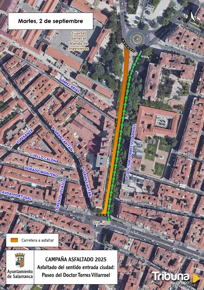 Por este motivo, mañana martes, 2 de septiembre, se producirán cortes de tráfico y desvíos en el paseo del Doctor Torres Villarroel, entre las glorietas de Santiago Martín 'El Viti' y de la UDS en sentido de entrada a la ciudad.