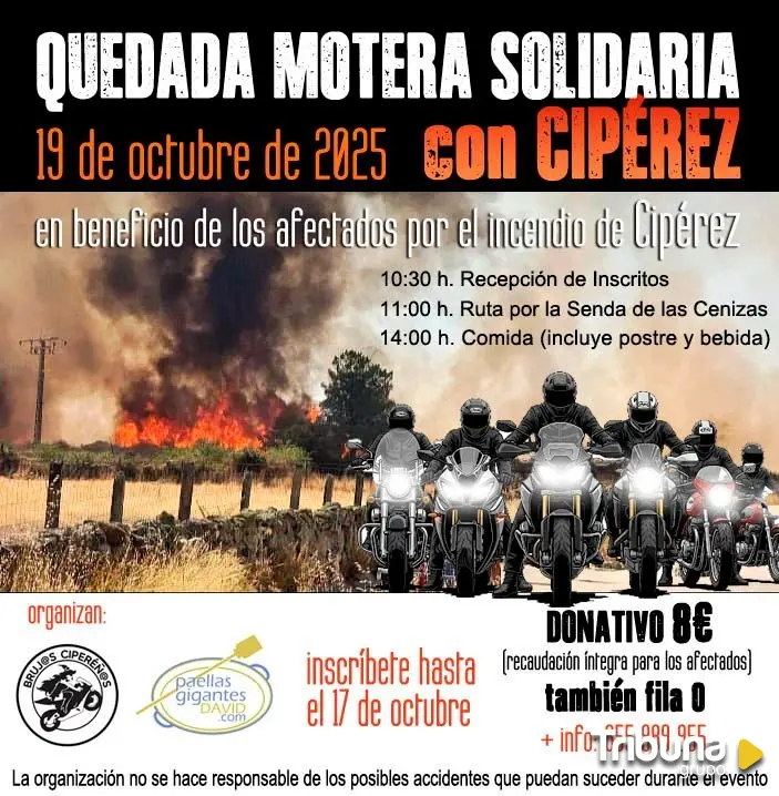 El grupo 'Brujos cipereños' ha preparado una quedada motera solidaria para el 19 de octubre. Lo recaudado dicha fecha -el donativo es de ocho euros- irá destinado de manera integra para los damnificados, contando también con la opción de participar mediante la denominada fila 0 a través del teléfono 655989955.