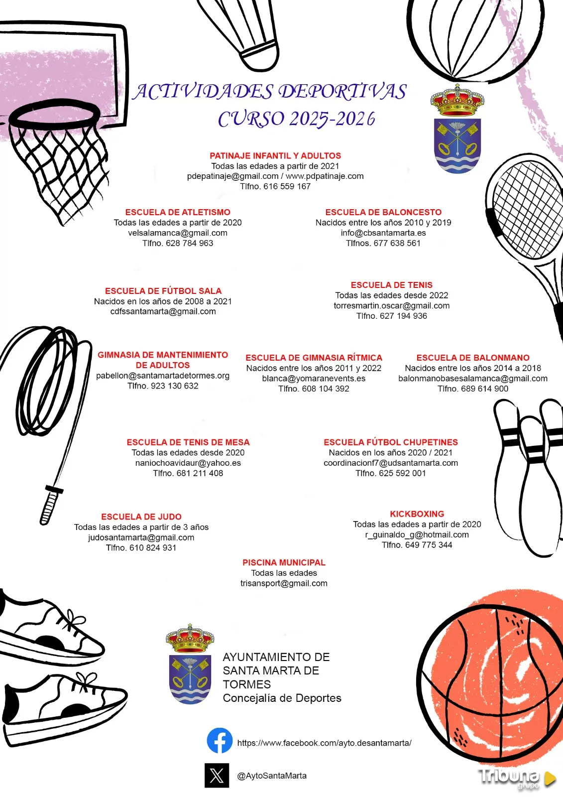 La oferta deportiva del Ayuntamiento de Santa Marta para este nuevo curso incluye 13 disciplinas que se podrán practicar a lo largo de la temporada 2025/2026 en las diferentes instalaciones con las que cuenta el municipio.