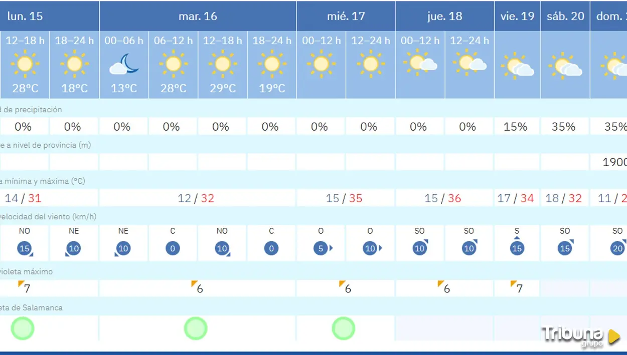 El calor se resiste a marcharse y el mes de septiembre todavía traerá alguna que otra jornada con los termómetros disparados por encima de los 35 grados en Salamanca. Así, la Agencia Estatal de Meteorología (Aemet) prevé una semana calurosa, especialmente miércoles y jueves, jornadas en las que en Salamanca no se bajará de los 35 grados de máximas.