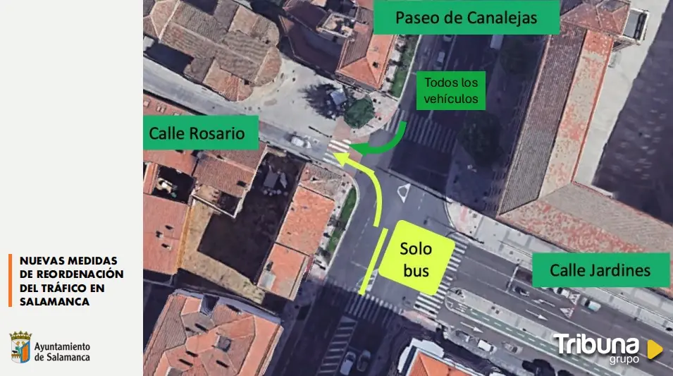 Es el segundo gran cambio que se avecina para el tráfico de Salamanca. La calle Rosario invierte su sentido para absorber el transporte urbano desde Canalejas a la Gran Vía. Los autobuses urbanos y metropolitanos, en lugar de entrar por Arroyo de Santo Domingo, lo harán por la calle Rosario en un giro a la izquierda desde Canalejas que estará únicamente permitido para estos servicios públicos. Según el edil, "se habilitará un tercer carril para hacer un giro que se regulará mediante un semáforo dotado con un sensor que únicamente se pondrá en verde cuando llegue un autobús, lo que incrementará notablemente la fluidez en el paseo de Canalejas".