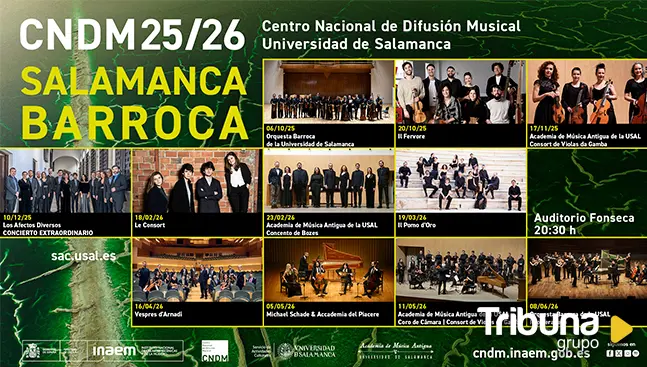 El Centro Nacional de Difusión Musical y la Universidad de Salamanca han trabajado conjuntamente para poner en marcha el XIII ciclo 'Salamanca Barroca', una iniciativa referente en el ámbito nacional e internacional de la interpretación musical con criterios historicistas. La programación ofrece un recorrido desde el renacimiento tardío hasta los albores del clasicismo, combinando repertorios consagrados con obras menos transitadas de especial interés histórico. El ciclo tendrá lugar en la Universidad de Salamanca, con once conciertos y cuatro actividades educativas del 6 de octubre de 2025 al 8 de junio de 2026.