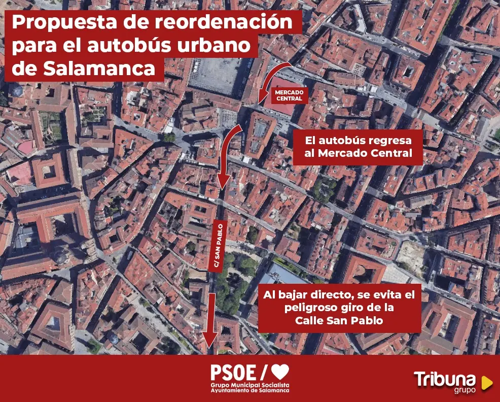 En cuando al primer apartado, planten una alternativa a su juicio "clara y sencilla" y que eliminaría el giro de riesgo en la calle Juan de la Fuente: "que los autobuses urbanos vuelvan a pasar por el Mercado Central y continúen por la calle San Pablo", como hacían hasta que se peatoanalizó el entorno. "No tiene sentido que se permita circular a furgonetas, coches y camiones y, en cambio, se excluya a un servicio público esencial como el autobús, con el consiguiente perjuicio para las personas mayores y para la actividad del propio Mercado Central", señala el concejal socialista Chema Collados.