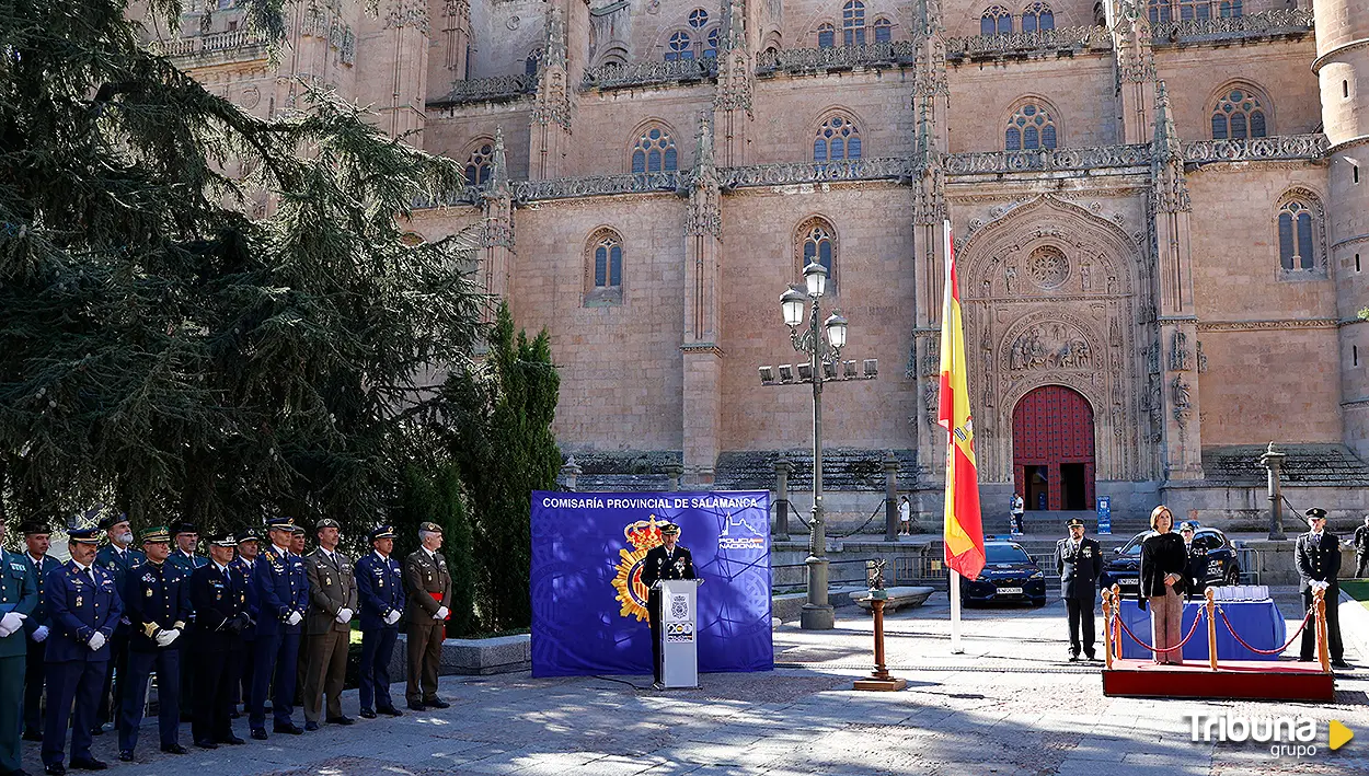 La Plaza de Anaya de Salamanca se ha convertido en escenario del acto institucional con motivo del Día de la Policía Nacional, y que ha estado presidido por la subdelegada del Gobierno, Rosa López, y el Comisario Jefe Provincial de Salamanca, Claudio Javier Díaz Serrano.