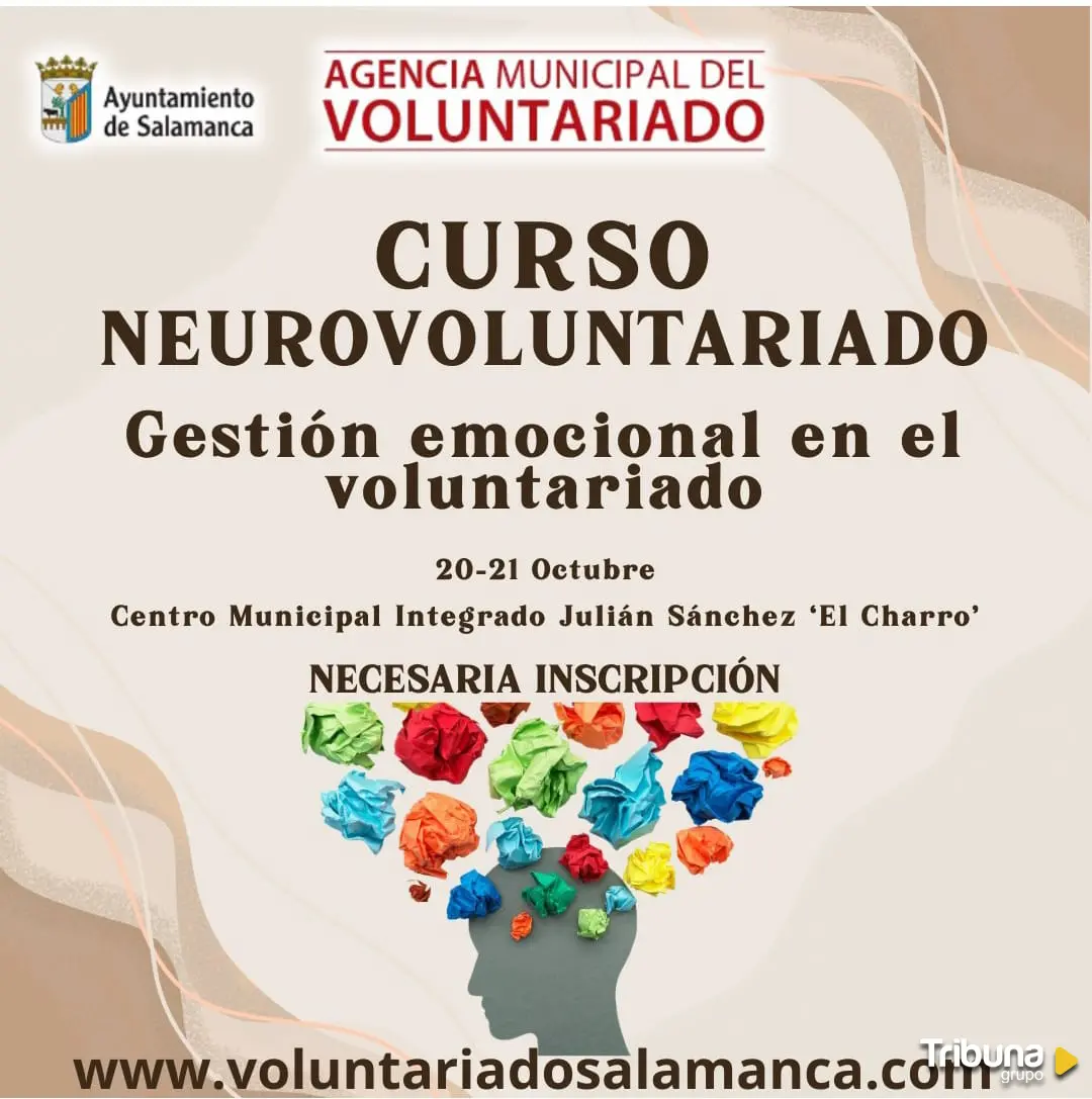 El Ayuntamiento de Salamanca organiza un curso formativo gratuito sobre gestión emocional en el voluntariado, incluido dentro de la programación de la Agencia Municipal del Voluntariado. El citado curso está programado los días 20 de octubre, de 18:00 a 21:00 horas; y 21 de octubre, de 17:00 a 20:00 horas, en el Centro Municipal Integrado Julián Sánchez 'El Charro'.