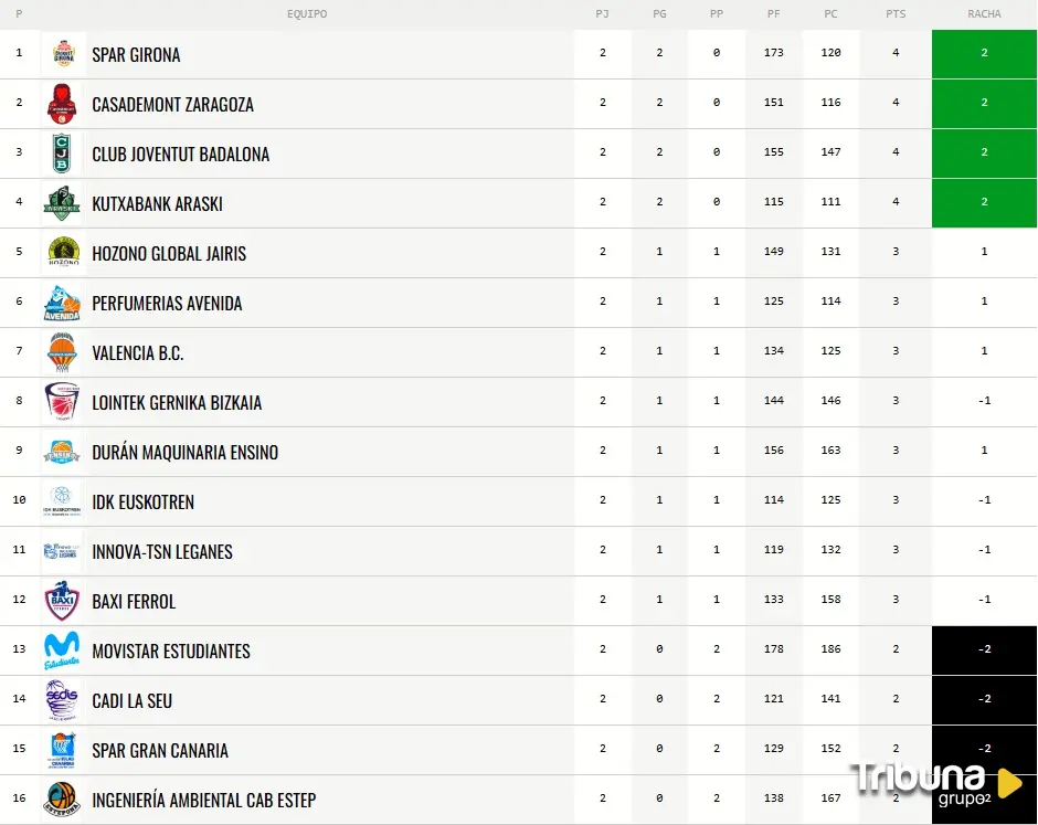 La segunda jornada de la Liga Femenina Endesa se resolvió con la primera victoria de Perfumerías Avenida que superó en casa a Cadí La Seu y de esta manera vuelve a convivir con la zona alta de la clasificación. Después de estas dos jornadas se sitúa en la sexta plaza precedido por Hozono Global Jairis y por delante se encuentran los cuatro equipos que se mantienen invictos después de sumar dos victorias en los dos encuentros. Por este orden: Spar Girona, Casademont Zaragoza, Joventut de Badalona y Araski.
