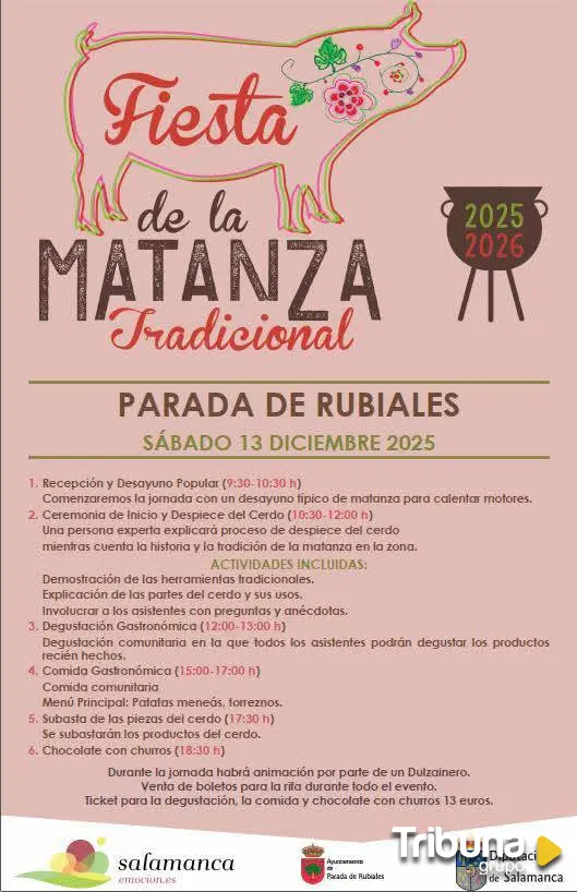 - Parada de Rubiales. Sábado, 13 de diciembre: Bienvenida con aguardiente y perronillas, escenificación de la matanza tradicional, degustación del cerdo, visita a bodega tradicional, comida, subasta de piezas del cerdo y visita a la finca de pistachos Telereta.