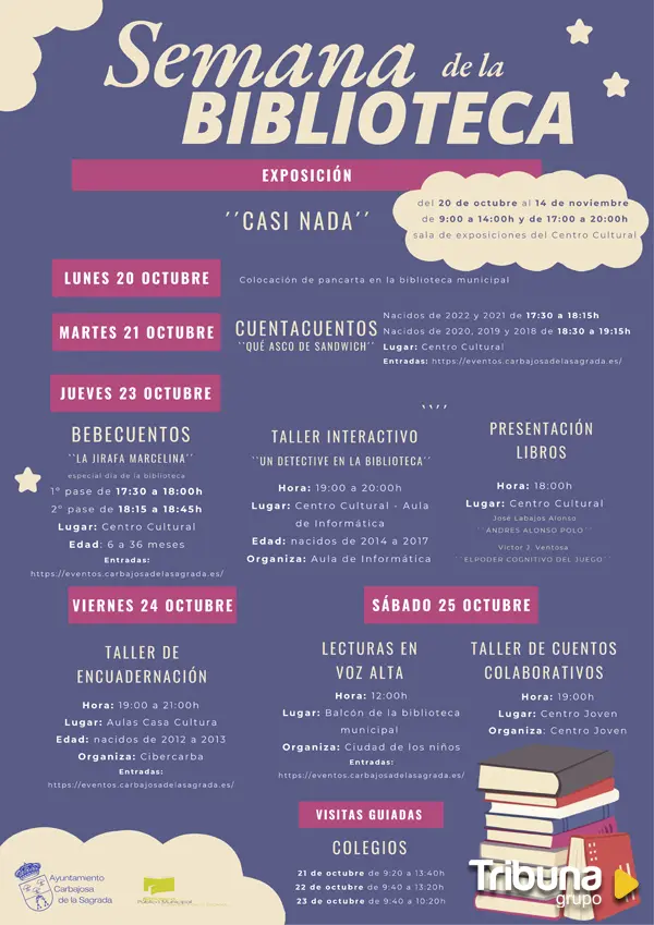 El viernes 24 de octubre, coincidiendo con el Día Internacional de la Biblioteca, habrá un taller de encuadernación a cargo de Cibercarba, mientras que el sábado se celebrarán dos propuestas especiales: a las 12:00 horas, los integrantes de La Ciudad de las Niñas y los Niños de Carbajosa realizarán lecturas en voz alta desde el balcón de la biblioteca, y por la tarde, a las 19:00 horas, se llevará a cabo un taller de cuentos colaborativos en el Centro Joven.
