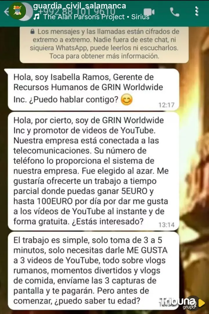 Sin embargo, llegado un momento le piden "invertir" dinero para obtener más ganancias e incrementar progresivamente las cuotas "hasta desaparecer con todo" el dinero que las víctimas les han confiado. Así, la Guardia Civil pide a los salmantinos que desconfíen de ofertas que prometan ingresos rápidos y, si han sido víctimas de este tipo de engaño, que lo denuncien de inmediato.