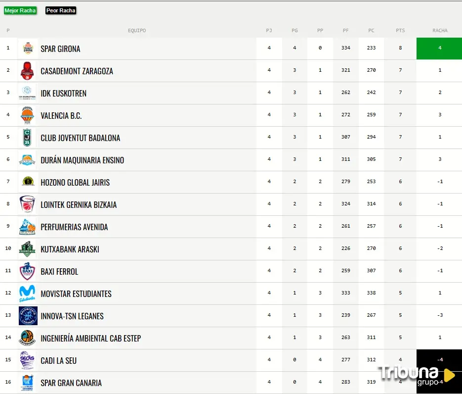 La derrota de Perfumerías Avenida ante IDK Euskotren suponen un frenazo en la trayectoria liguera del equipo salmantino que se marcha hasta la novena posición con dos victorias y dos derrotas en su casillero. Son pocos partidos de Liga pero si algo ha quedado demostrado es que no se puede dar nada por sentado y que las sorpresas empiezan a ser relativas. El 'verdugo' de Avenida se encarama a la tercera posición precedido únicamente por Casademont Zaragoza y un intratable Spar Girona que sigue pasando como un rodillo por encima de sus rivales. Muy atractivo el encuentro que mide a ambos en la próxima jornada.