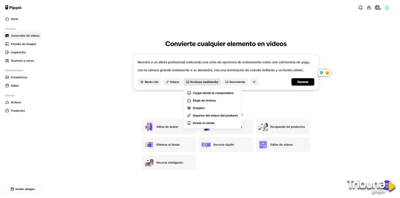 Primero, abre el editor de video gratuito y regístrate. Ve a la pestaña "Generador de videos" y añade tu texto descriptivo exactamente como quieres que sea tu video. También puedes subir archivos de referencia para garantizar una creación precisa del video. Haz clic en la pestaña "Archivos multimedia" para subir desde tu dispositivo, teléfono, Dropbox o enlace. Si no tienes archivos, selecciona de los recursos disponibles. Haz clic en la pestaña "Generar" para comenzar.