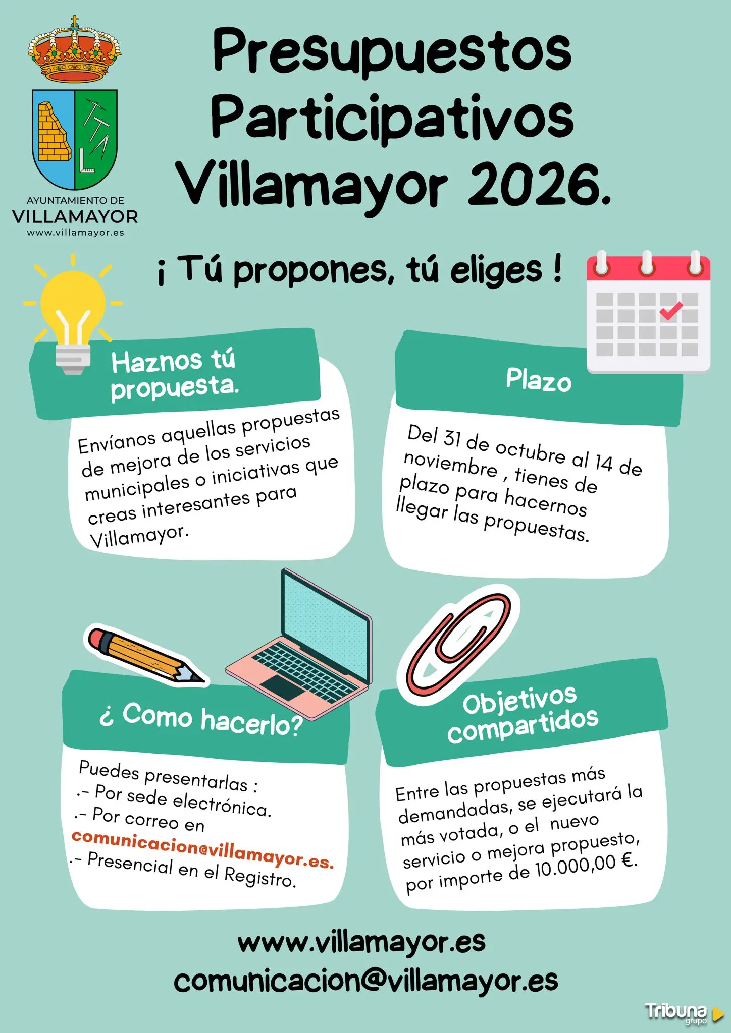 El Ayuntamiento de Villamayor ha abierto una nueva convocatoria del proyecto de Presupuestos Participativos 2026, una iniciativa que busca promover la participación directa de los vecinos en la definición y priorización de los proyectos municipales para el próximo ejercicio. Bajo el lema '¡Tú propones, tú eliges!', el Consistorio ha invitado a toda la ciudadanía a presentar sus ideas de mejora para el municipio entre el 31 de octubre y el 14 de noviembre.