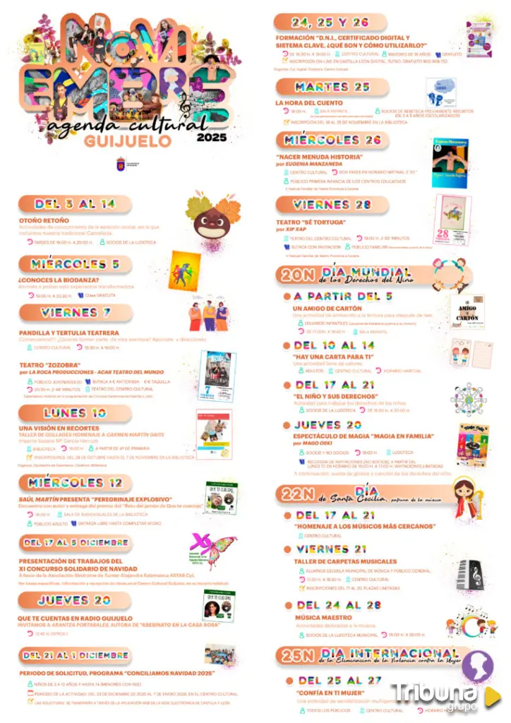 El mes de noviembre llega a Guijuelo con una agenda repleta de actividades culturales, formativas y solidarias dirigidas a todos los públicos. La programación municipal incluye diversas sesiones de artes escénicas, la conmemoración del Día Mundial de los Derechos del Niño y formaciones prácticas sobre el uso del certificado digital.