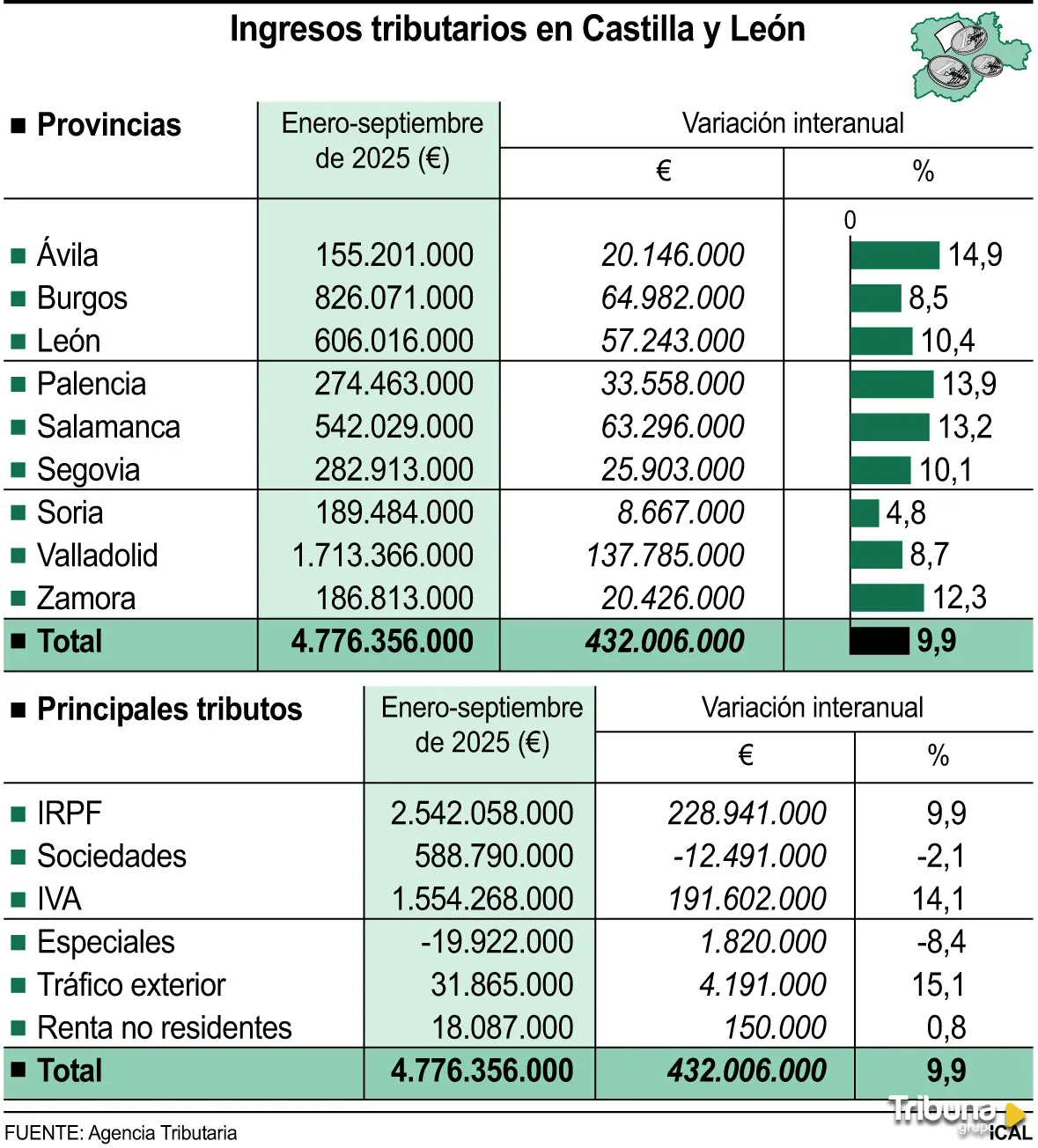 La buena marcha de la economía llena las arcas del Estado. Los datos de recaudación tributaria de Hacienda en la Comunidad, revelan un ritmo de crecimiento de casi dos dígitos respecto a las cifras récord de 2024. En concreto, la Agencia Tributaria constata unos ingresos tributarios en Castilla y León hasta septiembre de 2025, de 4.776,35 millones de euros, lo que supone un avance del 9,9 por ciento respecto al dato del año pasado.