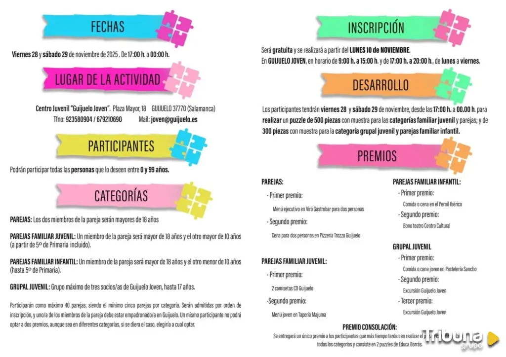 El concurso se celebrará el viernes 28 y sábado 29 de noviembre, en horario de 17:00 a 00:00 horas. Los participantes en las categorías parejas y familiar-juvenil deberán completar un puzzle de 500 piezas, mientras que los de grupal juvenil y parejas familiar-infantil trabajarán con un puzzle de 300 piezas.